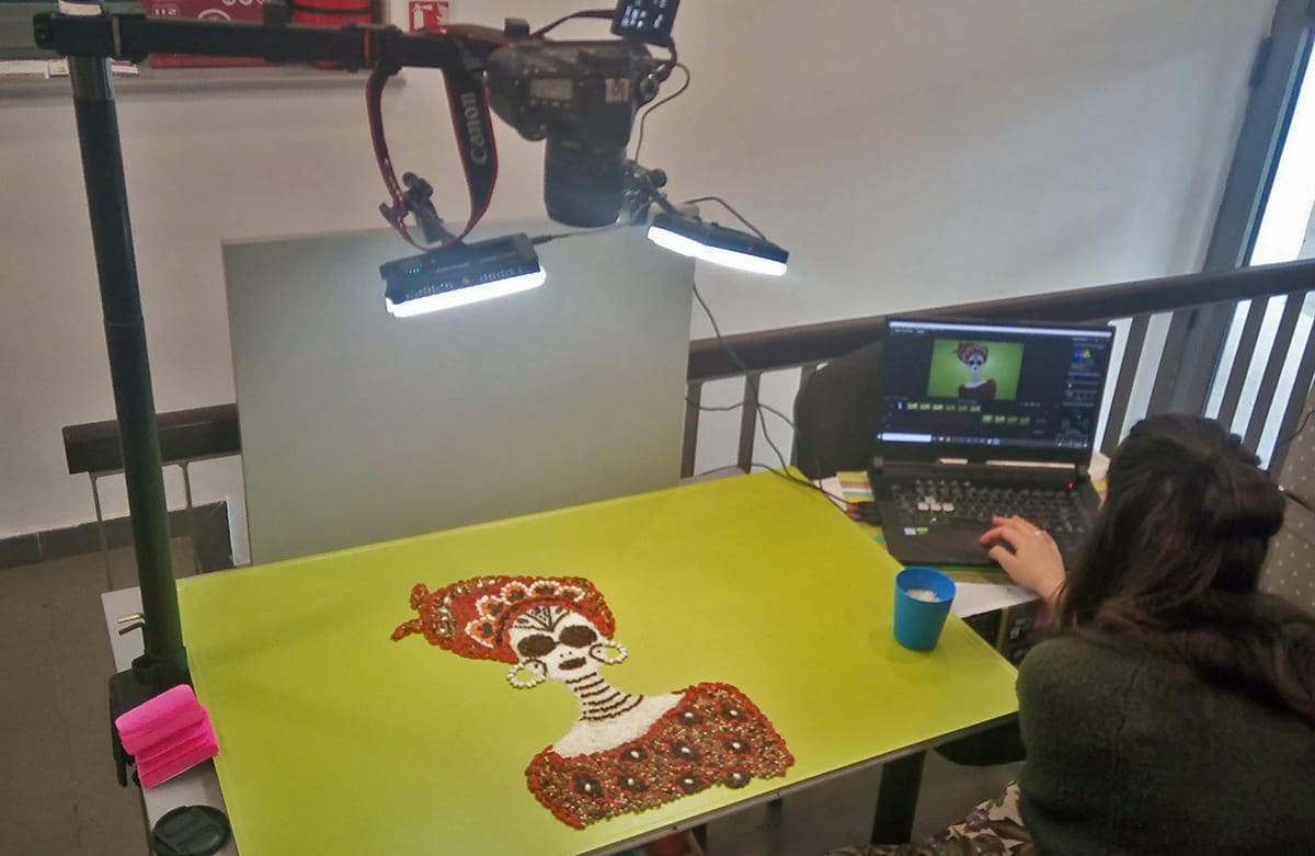After shooting, we edited out the green area. Thus, the visual elements with the transparent background, assembled from the seeds, were put together on a computer. Next we included the movements and composed the animation to music. The projection was another challenge, as the theatrical experience was born from the harmony of the music, the tale and the projected background.