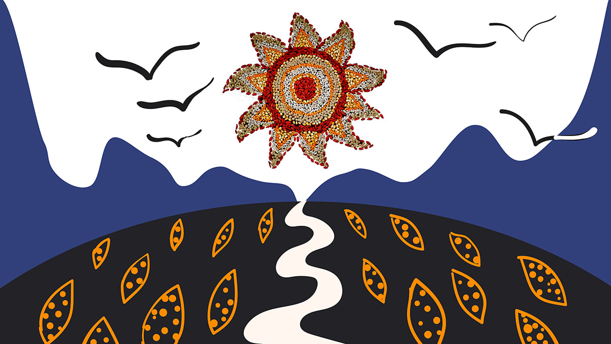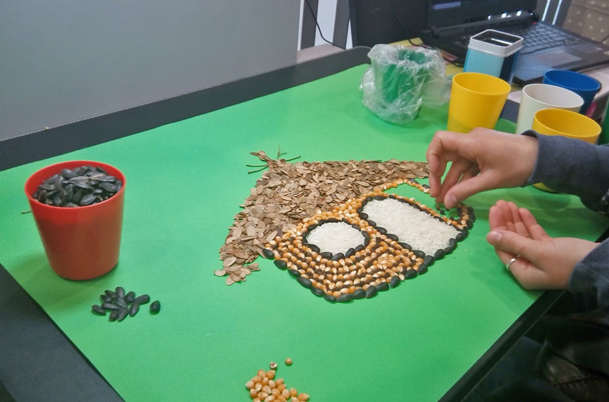 In the first phase, a computer graphic was created for all the visual elements, thus simulating the movement. Here you can see the sun, already made out of the seeds, while the others are still digital drawings.