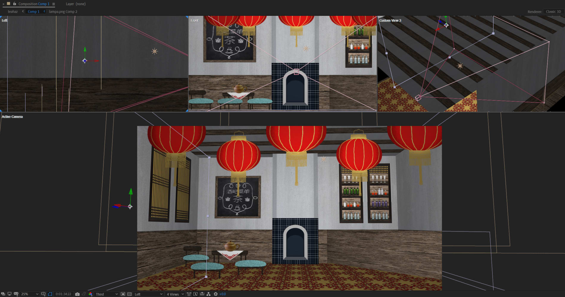 The graphic elements were placed in 3D environment, and the spatial effect was provided by the movement of the virtual camera and the digital light sources.